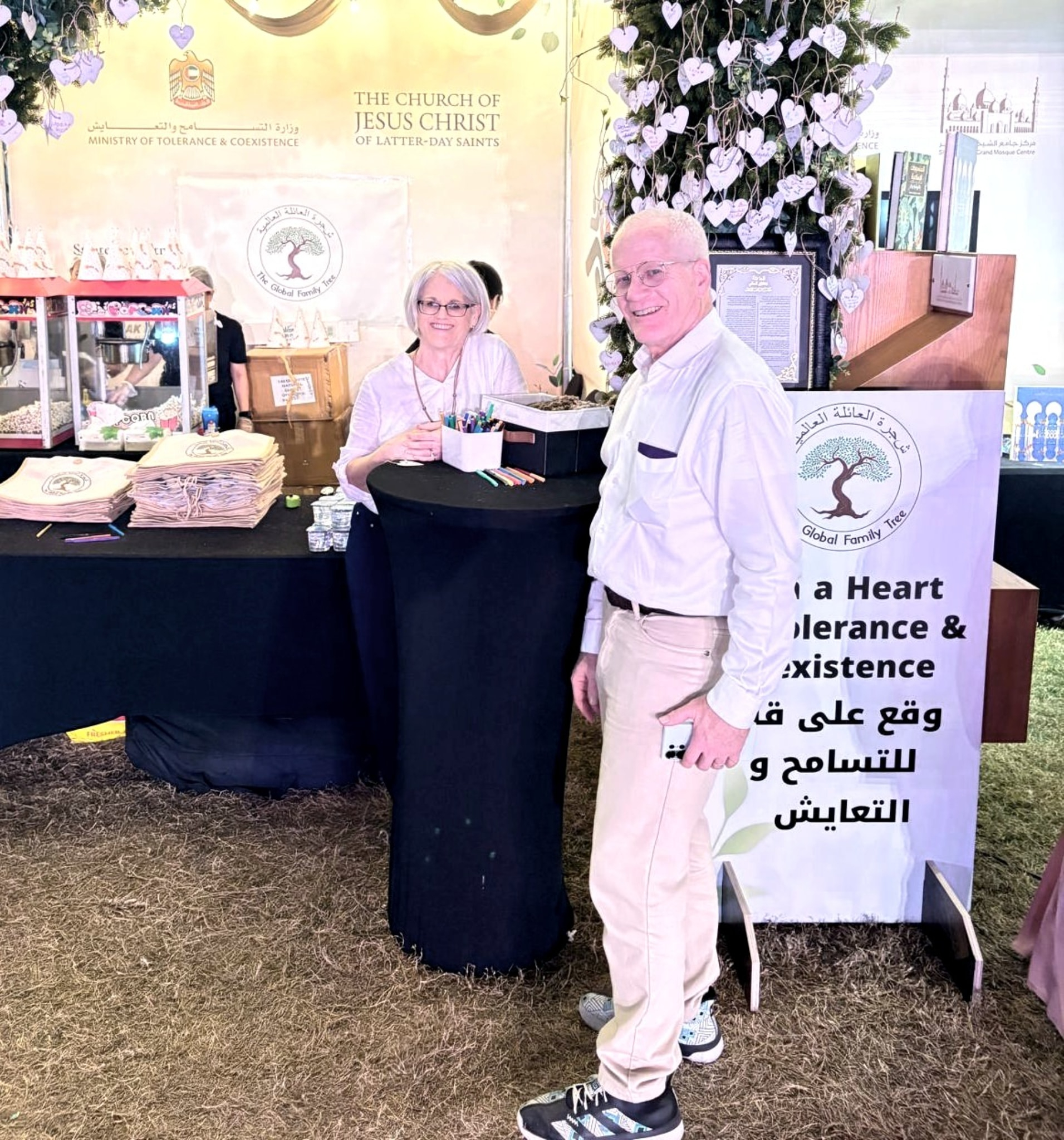 During the three-day event, Church volunteers from Abu Dhabi interacted with festivalgoers at an exhibit titled “The Global Family Tree: Branching Out in Love.” Around 6,700 booth visitors were invited to sign a heart-shaped cutout to hang from a tree, symbolizing the shared connection of the human family.