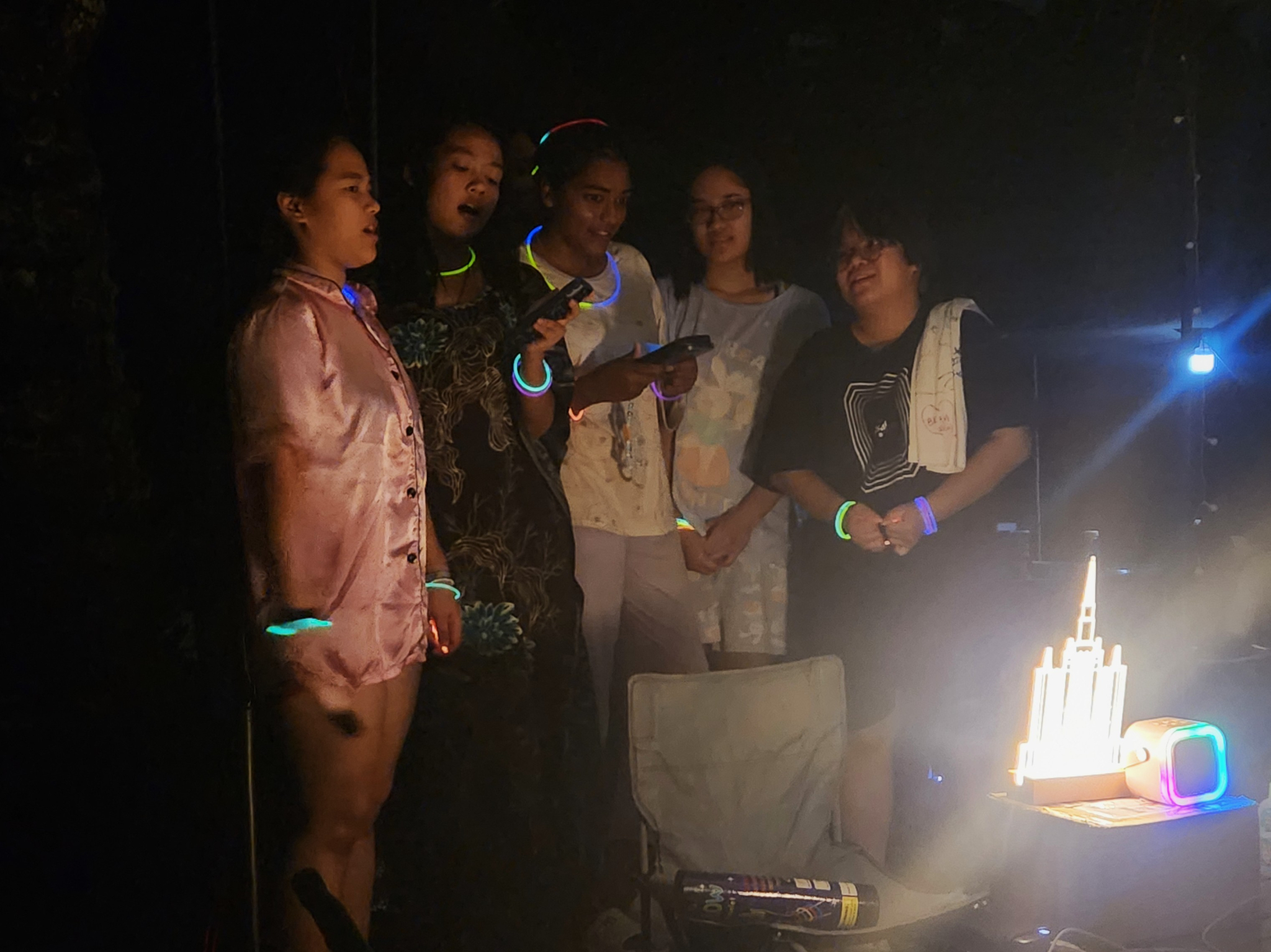 On Monday night, camp chaperones Brian and Sukanya Chan, along with their children Anika and Isaiah, shared a Family Home Evening lesson on the “light of Christ”. Each young woman was given several glow sticks, which they collectively intertwined into creative designs and patterns. This provided a pleasant soft-lit atmosphere as the young women ended the spiritual evening by singing “Fear not”, “Daughter of Light” and “Look Unto Christ”.